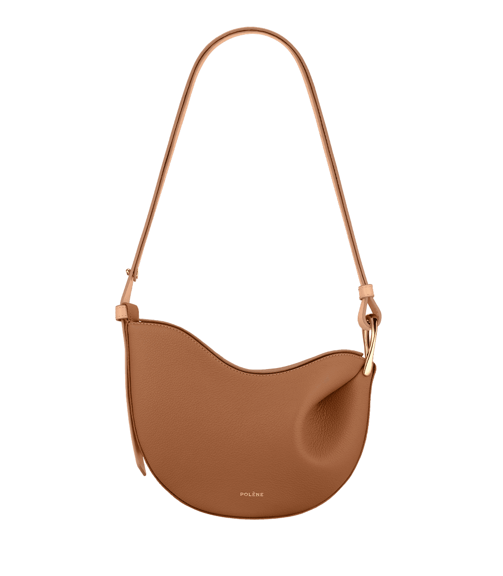 Obtenue par le modelage du cuir sur moule en bois, la forme ronde de la besace "Tonca" est galbée par les plis dont le mouvement se prolonge dans la boucle métallique torsadée. Corps du sac et bandoulière contrastent par un jeu de cuirs lisse et grainé.
